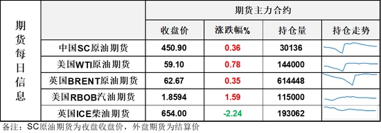 【1】WTI主力原油期貨收漲0.46美元,漲幅0.78%,報(bào)59.1美元/桶;布倫特主力原油期貨收漲0.22美元,漲幅0.35%,報(bào)62.67美元/桶;INE原油期貨收漲0.36%,報(bào)450.9元。