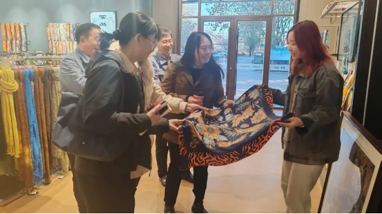 在淄博大染坊絲綢集團(tuán)有限公司,實(shí)地參觀了生產(chǎn)車間、絲綢主題文化展廳。作為全國(guó)制造業(yè)單項(xiàng)冠軍示范企業(yè),大染坊擁有從繅絲、織造到練染印的完整產(chǎn)業(yè)鏈,其絲綢面料織造產(chǎn)量穩(wěn)居全國(guó)首位。企業(yè)將傳統(tǒng)絲織技法融入現(xiàn)代生產(chǎn)工藝,創(chuàng)新研發(fā)的國(guó)潮國(guó)風(fēng)絲巾等系列手造產(chǎn)品,暢銷全球50多個(gè)國(guó)家地區(qū)。