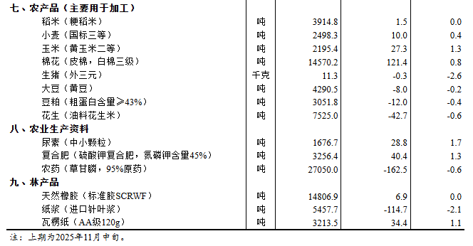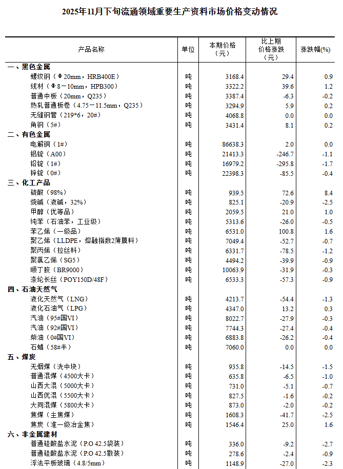 2025年11月下旬流通領域重要生產(chǎn)資料市場價格變動情況