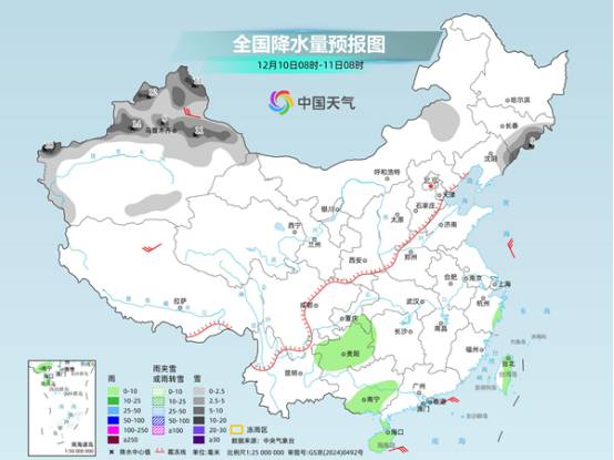明天,黑龍江西北部、新疆北部、西藏東部、青海南部等地部分地區(qū)有小雪或雨夾雪,其中,新疆北疆北部、西藏東部等地部分地區(qū)有中到大雪,新疆北疆北部局地暴雪。陜西南部、西南地區(qū)東部、海南島東部、臺(tái)灣島東部等地部分地區(qū)有小雨,局地中雨。