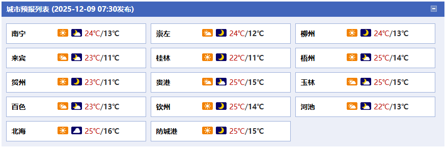 南寧市:今天白天到晚上,晴間多云,偏東風1~2級,最高氣溫25℃,最低氣溫14℃。