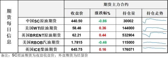【1】WTI主力原油期貨收漲0.21美元,漲幅0.36%,報58.46美元/桶;布倫特主力原油期貨收漲0.27美元,漲幅0.44%,報62.21美元/桶;INE原油期貨收跌0.86%,報440.5元。