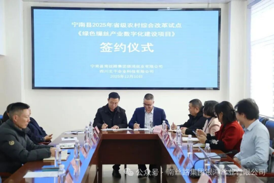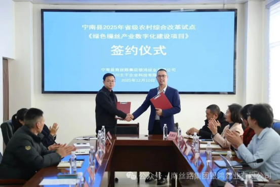 在全場見證下,銀鴻絲業(yè)與主干企服科技公司正式簽署戰(zhàn)略合作協(xié)議,全體參會人員以“F9數(shù)智絲業(yè)·南絲路綠色繅絲產(chǎn)業(yè)數(shù)字化建設(shè)項目啟動儀式”的橫幅為背景定格瞬間,雙方負(fù)責(zé)人握手合影環(huán)節(jié)更彰顯企業(yè)協(xié)同、產(chǎn)學(xué)研融合的堅定決心。隨著啟動會的圓滿落幕,銀鴻絲業(yè)正以數(shù)字化為筆,在鄉(xiāng)村振興的畫卷上書寫綠色發(fā)展的新篇章。