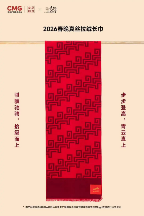 12月10日,中央廣播電視總臺《2026年春節(jié)聯(lián)歡晚會》發(fā)布主題和主標識,其主標識為“騏驥馳騁紋”,同款紋樣的紅圍巾同步亮相。這抹承載著團圓期盼的“吳江紅”,已是總臺文創(chuàng)與“吳江游禮”的第三年聯(lián)名之作。