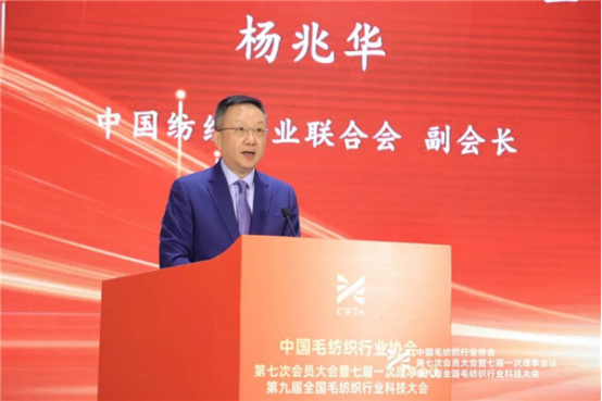中國紡織工業(yè)聯(lián)合會副會長楊兆華宣讀《關(guān)于中國毛紡織行業(yè)協(xié)會第七屆負(fù)責(zé)人人選審核結(jié)果的通知》