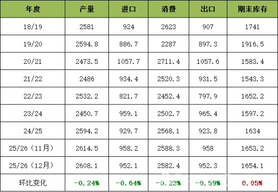 25/26年度主要的棉花主產(chǎn)國的產(chǎn)量以豐產(chǎn)或高產(chǎn)為主,全球需求總體表現(xiàn)一般,因此全球供給仍偏寬松。受產(chǎn)量增加、消費量下降影響,最終期末庫存處于近6個年度平均值下方,整體壓力不大。綜合來看,本次報告指引有限,市場反應(yīng)平淡。