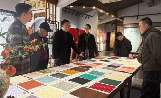 調(diào)研過程中,在省級(jí)非物質(zhì)文化遺產(chǎn)代表性傳承人、企業(yè)負(fù)責(zé)人朱立群及李笑蘇的陪同下,王柯院長(zhǎng)一行深入企業(yè)技藝與產(chǎn)品展陳空間,系統(tǒng)考察蘇羅織物的織造流程、材料特性及其在現(xiàn)代設(shè)計(jì)中的轉(zhuǎn)化路徑。學(xué)院教師重點(diǎn)關(guān)注傳統(tǒng)工藝如何在當(dāng)代生活中被重新詮釋與應(yīng)用,并就技藝細(xì)節(jié)、紋樣文化內(nèi)涵與創(chuàng)新可能性進(jìn)行了現(xiàn)場(chǎng)交流與記錄。