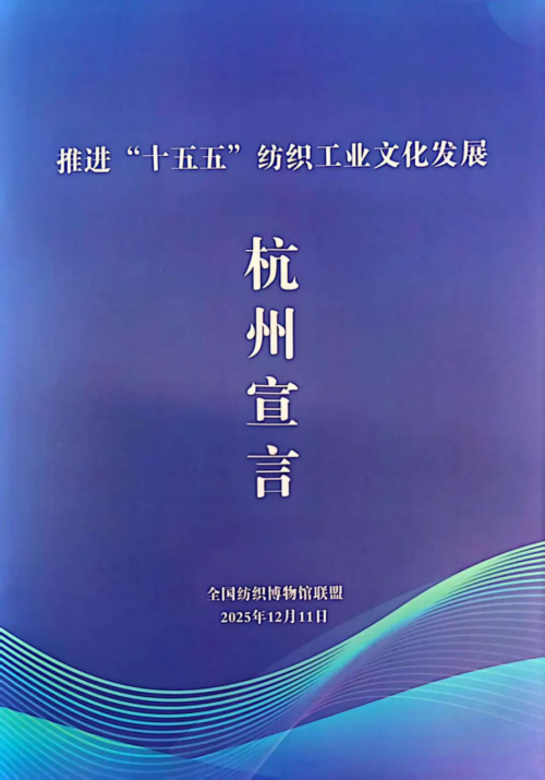 會上還發(fā)布了《推進“十五五”紡織工業(yè)文化發(fā)展杭州宣言》。宣言提出六大行動綱領:深植文明根脈,構(gòu)筑紡織文化理論體系;推動文化、科技與產(chǎn)業(yè)融合創(chuàng)新;以“產(chǎn)業(yè)文化化”與“文化產(chǎn)業(yè)化”賦能時尚升級;賡續(xù)綠色理念,弘揚可持續(xù)發(fā)展文化;拓展社會協(xié)作,建設開放共享的紡織文化共同體;深化文明互鑒,共筑絲路精神新時代榮光,呼吁全國紡織博物館及相關機構(gòu)共同行動,以文化力量支撐現(xiàn)代化紡織強國建設。
