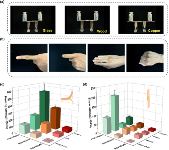 RSF/Mg(II)復(fù)合薄膜顯示出對(duì)木材、紙張,尤其是豬皮的強(qiáng)烈附著力,在豬皮上的剝皮強(qiáng)度達(dá)到132.0牛/米,超過(guò)了市面上可用的醫(yī)療膠帶和敷料。10×10毫米R(shí)SF/Mg20薄膜能夠附著在玻璃、銅和木材等表面,能夠在兩面承受100克配重而不脫落,還能貼合手指關(guān)節(jié)、手掌等活動(dòng)部位。