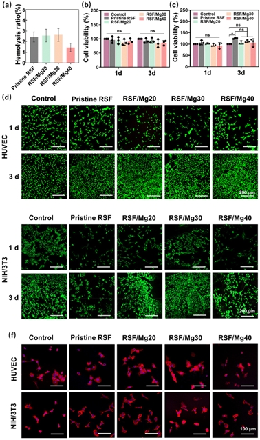 純凈的RSF薄膜和RSF/Mg(II)復(fù)合薄膜的溶血率均低于5%,符合生物相容性標(biāo)準(zhǔn)。SF/Mg(II)復(fù)合片細(xì)胞毒性極小,具有優(yōu)異生物相容性,支持細(xì)胞的粘附和浸潤(rùn),這在傷口愈合的早期階段至關(guān)重要。
