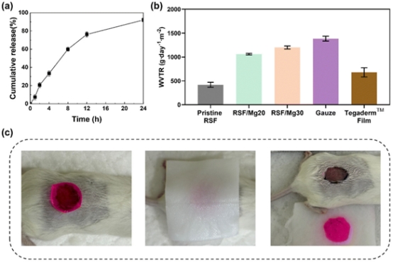 RSF/Mg20膠片中的Mg(II)離子幾乎在PBS中24小時(shí)內(nèi)穩(wěn)定釋放,且無(wú)突發(fā)釋放。RSF/Mg20薄膜的水汽透過(guò)率為1060g/m2/day,約為醫(yī)用紗布的76%,且明顯高于純RSF薄膜(419 g/m2/day)以及商業(yè)敷料Tegaderm?(679 g/m2/day)。
