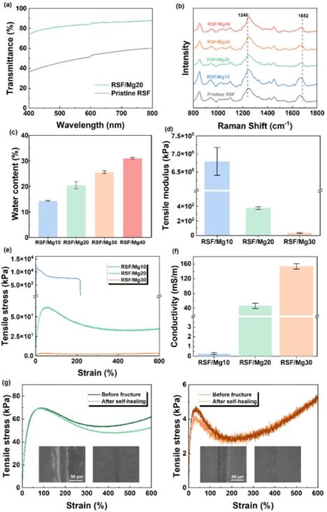 將Mg離子摻入薄膜,增強(qiáng)了其從環(huán)境中吸收水分的能力,提高了薄膜的柔韌性。Mg濃度從10wt%到20wt%,復(fù)合薄膜的拉伸模量從約680兆帕降至約380千帕,接近人體皮膚的彈性模量。Mg離子的摻入賦予復(fù)合薄膜離子導(dǎo)電性,其離子導(dǎo)電率隨著Mg離子含量顯著增加。此外,薄膜還具有自我修復(fù)的特性,自修復(fù)后1小時(shí)對(duì)愈合薄膜進(jìn)行的拉伸測(cè)試顯示其機(jī)械性能與原始薄膜相當(dāng)。