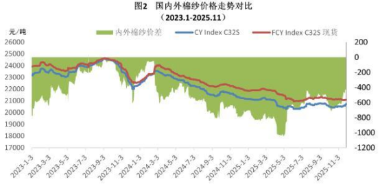 本月棉花市場(chǎng)反彈帶動(dòng)國內(nèi)棉紗價(jià)格暫時(shí)企穩(wěn),但整體市場(chǎng)未有顯著改善,終端需求偏弱與庫存壓力對(duì)漲幅造成壓制,短期市場(chǎng)仍將維持震蕩偏穩(wěn)運(yùn)行。進(jìn)口棉紗價(jià)格維持跌勢(shì),雖然有溯源訂單支撐,但下游接受度不高,實(shí)際成交優(yōu)惠力度較大。國產(chǎn)32支純棉紗11月均價(jià)為20564元/噸,環(huán)比上漲94元/噸,增幅0.5%,同比下跌931元/噸,跌幅4.3%;進(jìn)口32支純棉紗月均價(jià)為21097元/噸,環(huán)比下跌33元/噸,跌幅0.2%,同比下跌1090元/噸,跌幅4.9%。