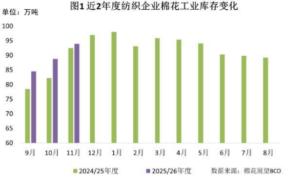 11月新棉大量上市,紡織企業(yè)前期預(yù)采購棉花到庫,加上部分剛需補(bǔ)庫,原料庫存有所上升。截至11月底紡織企業(yè)在庫棉花工業(yè)庫存量為94萬噸,較上月底增加5.1萬噸。紡織企業(yè)可支配棉花庫存量為110.6萬噸,較上月底增加4萬噸。其中:41%的企業(yè)增加棉花庫存,28%減少,31%基本保持不變。