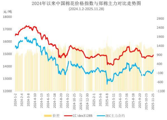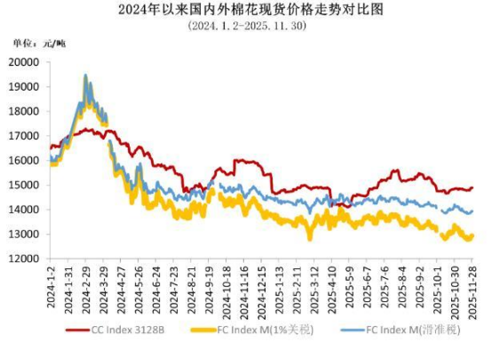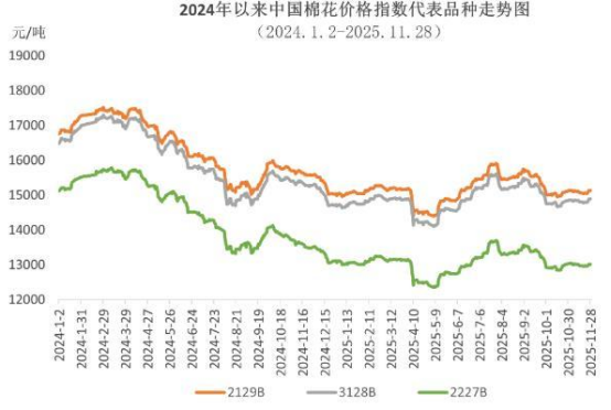 11月上中旬國內(nèi)新棉加工進(jìn)入高峰期,上市資源持續(xù)增加,市場供應(yīng)總體寬松,而紡織企業(yè)季節(jié)性需求下降,國內(nèi)現(xiàn)貨價(jià)格震蕩走弱,中國棉花價(jià)格指數(shù)由月初的14859元/噸下跌至最低14779元/噸。月下旬,相關(guān)部門聯(lián)合印發(fā)《關(guān)于增強(qiáng)消費(fèi)品供需適配性進(jìn)一步促進(jìn)消費(fèi)的實(shí)施方案》,加上中美元首通話顯示兩國關(guān)系總體穩(wěn)定向好,帶動(dòng)市場信心回升,國內(nèi)棉價(jià)持續(xù)反彈,中國棉花價(jià)格指數(shù)月底收于最高點(diǎn)14896元/噸,月均價(jià)為14831元/噸,環(huán)比上漲67元,同比下跌497元。