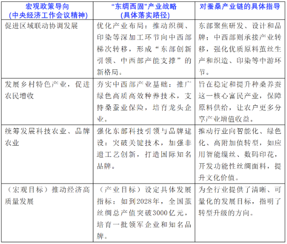 具體來看,國家層面的產(chǎn)業(yè)戰(zhàn)略(如“東綢西固”)可以看作是中央經(jīng)濟(jì)工作會(huì)議精神在蠶桑領(lǐng)域的具體實(shí)踐和延伸。宏觀政策與產(chǎn)業(yè)發(fā)展戰(zhàn)略的對應(yīng)關(guān)系具體體現(xiàn)在如下幾方面:
