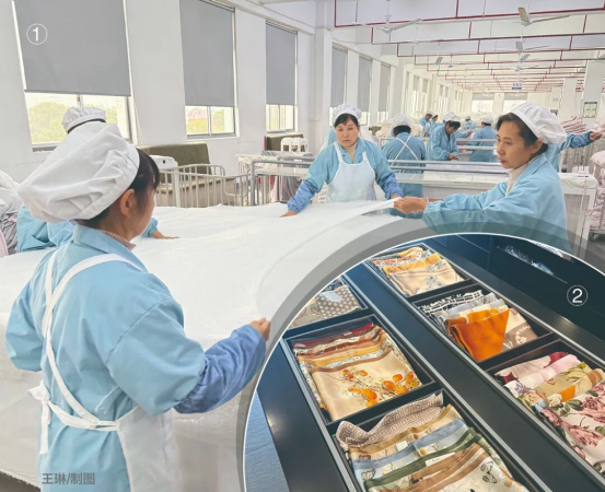 在中游,原料穩(wěn)定保障智能制造。在生產(chǎn)車間,太湖雪探索出了“現(xiàn)代技術(shù)+傳統(tǒng)工藝”的融合模式。智能剪裁設(shè)備按設(shè)計(jì)圖紙精準(zhǔn)裁切蠶絲棉片,保障了批量生產(chǎn)的尺寸一致性;而手工拉絲這一核心非遺工藝被完整保留,工人們身著統(tǒng)一的藍(lán)色工裝,按標(biāo)準(zhǔn)將棉片層層拉伸梳理,鋪展成均勻蓬松的被芯。這種人機(jī)協(xié)作的方式,既保證了蠶絲被的天然蓬松度,又解決了規(guī)?;a(chǎn)的效率與標(biāo)準(zhǔn)化難題。