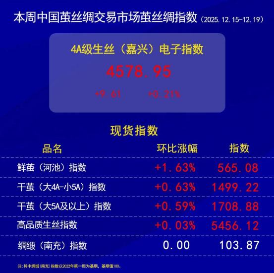今日(2025年12月19日,周五)中國(guó)繭絲綢交易市場(chǎng)生絲電子指數(shù)上漲0.35%報(bào)收于4578.95點(diǎn),本周生絲指數(shù)累計(jì)上漲0.21%。B絲2022D(商檢4A級(jí)生絲):251225合約上漲0.15萬(wàn)元報(bào)收于45.78萬(wàn)元;260325合約上漲0.27萬(wàn)元報(bào)收于46.08萬(wàn)元;260925合約上漲0.18萬(wàn)元報(bào)收于45.69萬(wàn)元。