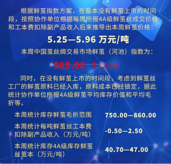 鮮繭價(jià)格指數(shù)方面,本周漲幅較為顯著。根據(jù)指數(shù)編制規(guī)則,在沒(méi)有鮮繭上市的時(shí)間段,通過(guò)單位報(bào)送的生絲成交價(jià)格、工本費(fèi)等核心指標(biāo),推導(dǎo)蠶繭價(jià)格,同時(shí)結(jié)合當(dāng)前 繅絲企業(yè)已完成鮮繭入庫(kù)并鎖定生產(chǎn)成本的實(shí)際,增加當(dāng)庫(kù)存繭本、工本費(fèi)、毛折等幅度等的統(tǒng)計(jì)維度。當(dāng)前顯示,繭絲價(jià)格倒掛較為明顯。