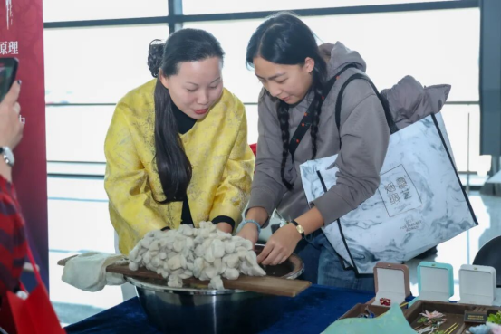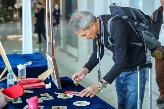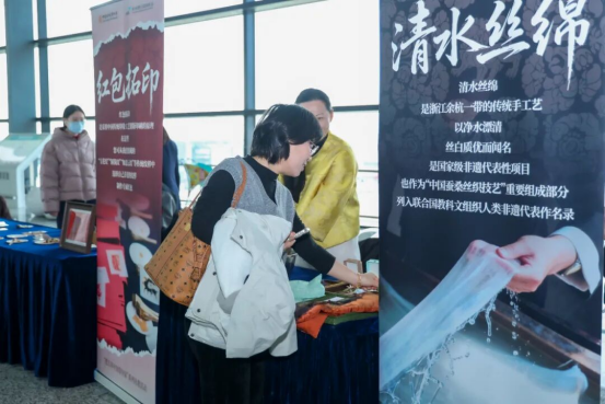 “把吉祥中國(guó)帶回家”公眾體驗(yàn)活動(dòng)是國(guó)絲公共教育品牌的全新延伸,將圍繞春節(jié)、端午和中秋等傳統(tǒng)佳節(jié),推出貼合大眾需求的絲綢主題手作活動(dòng)。在現(xiàn)場(chǎng)體驗(yàn)區(qū),旅客們體驗(yàn)吉祥紋樣拓印、扎染項(xiàng)目,觀看“清水絲綿”非遺傳承人現(xiàn)場(chǎng)展演傳統(tǒng)技藝,紛紛駐足觀摩、拍照記錄。