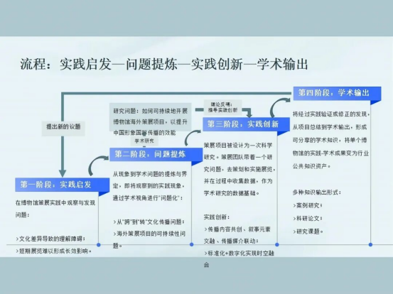 報告研究當(dāng)今博物館從業(yè)者都面臨有限的資源(預(yù)算、人力、時間等)與現(xiàn)代博物館的多樣化責(zé)任(保存、研究、教育、國際傳播等)之間的矛盾,認(rèn)為解決該矛盾的模式是將實踐與學(xué)術(shù)進行深度融合,即將“行動中的認(rèn)識”轉(zhuǎn)化為可供系統(tǒng)探究的學(xué)術(shù)問題,學(xué)術(shù)研究又賦予策展實踐以深刻的洞察力和創(chuàng)新方向的雙向賦能機制。以“國絲環(huán)球展柜”為例,通過踐行“實踐與學(xué)術(shù)深度融合”,實現(xiàn)海外策展項目的可持續(xù)發(fā)展,其核心是將展覽視為“學(xué)術(shù)田野”,每一次策展都視為一次“實踐研究”;流程是“實踐啟發(fā)——問題提煉——實踐創(chuàng)新——學(xué)術(shù)輸出”。