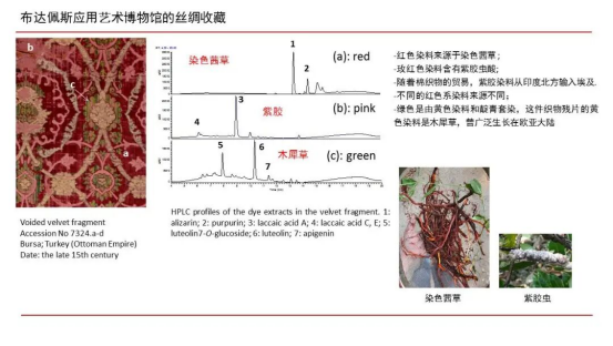 本研究使用高效液相色譜-離子阱質(zhì)譜(HPLC-IT-MS)對中國絲綢博物館、北京藝術(shù)博物館和布達佩斯應(yīng)用藝術(shù)博物館獲得的歷史紡織品進行了染料分析。檢測結(jié)果揭示了15至19世紀(jì)東西方使用的天然染料。在中國和歐洲的紡織品中,蘇木和靛青被用來染紅色和藍(lán)色。然而,染色茜草和木犀草僅用于歐洲紡織品,而紅花和槐米則常用于中國紡織品著色。有趣的是,自16世紀(jì)初以來從墨西哥進口到西班牙的美洲胭脂蟲也在中國的龍袍和馬鞍中被發(fā)現(xiàn),這條線索為17世紀(jì)的全球貿(mào)易提供了間接證據(jù)。
