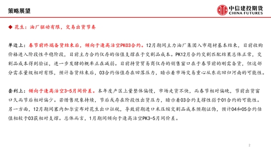 摘要:單邊上:春節(jié)前終端備貨結束后,傾向于逢高沽空PK03合約。12月期間主力油廠集團入市題材基本結束,目前收購價格進入階段性平穩(wěn)階段,目前主力合約僅存的估值支撐在于交割品成本。PK12月合約交割匹配結果總體正常,交割品成本得到驗證,進一步發(fā)酵的概率正在減弱。目前持貨貿易商僅存的銷售窗口在于春節(jié)前的剛需備貨,但這部分需求量級相對有限,預計備貨結束后,03合約估值存在回落壓力,暗示著市場交易重心從東北回歸河南的可能性。