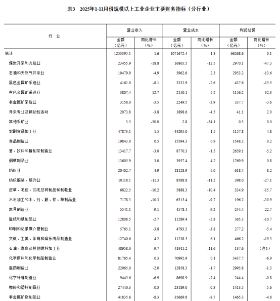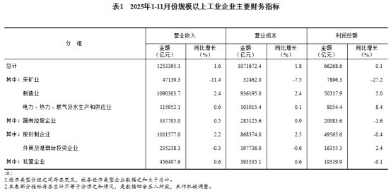1—11月份,全國(guó)規(guī)模以上工業(yè)企業(yè)實(shí)現(xiàn)利潤(rùn)總額66268.6億元,同比增長(zhǎng)0.1%(按可比口徑計(jì)算,詳見(jiàn)附注二)。