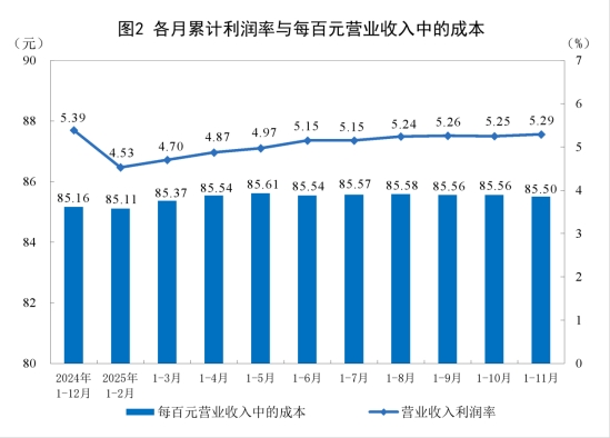 1—11月份,規(guī)模以上工業(yè)企業(yè)每百元營(yíng)業(yè)收入中的成本為85.50元,同比增加0.18元;每百元營(yíng)業(yè)收入中的費(fèi)用為8.39元,同比減少0.06元。