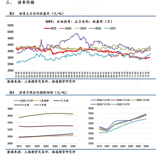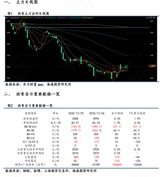 【1】盤面表現(xiàn):BU 2602合約日內(nèi)早盤大幅跌落后,又被多頭資金拉升起來,最終維持區(qū)間震蕩。收盤3008,漲幅0.23%,盤中最高觸及3016,最低2967,近7天累計(jì)+1.9%。次月合約2603漲幅0.17%,合約期限仍呈現(xiàn)近低遠(yuǎn)高的Contango結(jié)構(gòu),但相比11月份已經(jīng)有所收窄。