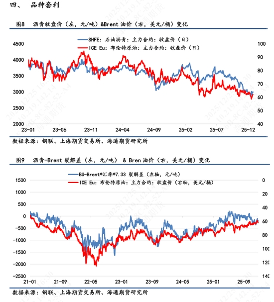 【4】基本面變化:上周最新的周度數(shù)據(jù)表現(xiàn)來看,供應(yīng)端,12月26日當(dāng)周中國煉廠產(chǎn)量為55.3萬噸,環(huán)比增長14%;需求端,當(dāng)周道路改性瀝青開工率為20%,連續(xù)4周下滑。市場低價(jià)貨源依舊競爭出貨,大樣本山東生產(chǎn)企業(yè)出貨量當(dāng)周為14.86萬噸,環(huán)比增加19%。庫存端,當(dāng)周社會+廠內(nèi)庫存達(dá)到66.6萬噸,環(huán)比增加4%。整體基本面數(shù)據(jù)來看,沒有過多的亮點(diǎn),反而更多體現(xiàn)了淡季行情下的弱基本面結(jié)構(gòu),對瀝青價(jià)格上行形成壓力。