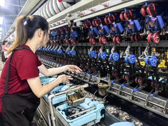 車(chē)間里,工人們各司其職,有條不紊地操作著各種機(jī)器設(shè)備。一顆顆小小的蠶繭,在他們的手中經(jīng)過(guò)選繭、煮繭、繅絲、復(fù)搖、整理等多道工序,變成了一根根綿細(xì)的生絲。這些生絲潔白如雪,質(zhì)地柔軟,散發(fā)著淡淡的光澤。隨后,生絲又被送往不同的生產(chǎn)線(xiàn)上,經(jīng)過(guò)編織等工藝,最終生產(chǎn)出了高品質(zhì)的白廠(chǎng)絲、蠶絲被等產(chǎn)品,走向全國(guó)各地的市場(chǎng)。