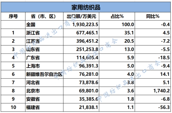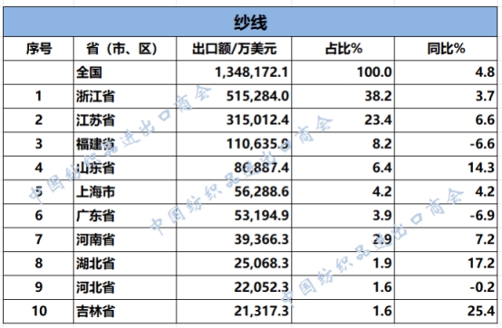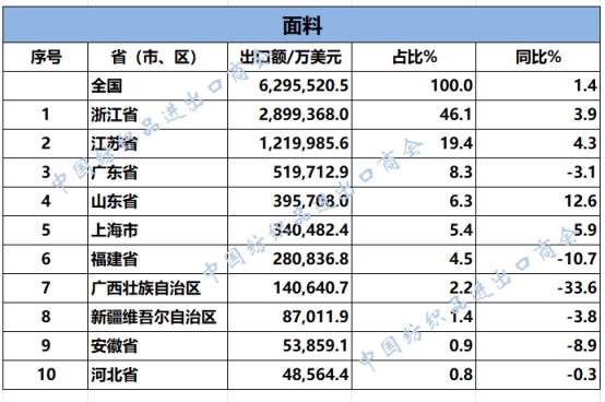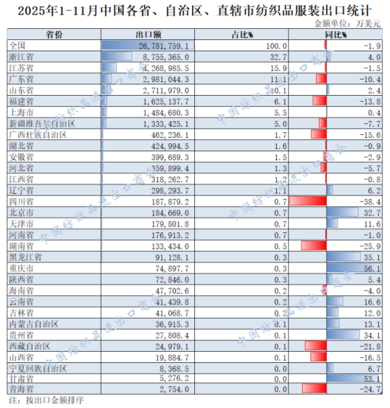 2025年1-11月,我國紡織服裝累計出口2678.18億美元,同比下降1.9%。浙江省、江蘇省、廣東省、山東省、福建省分別列全國紡織服裝出口省市前五位,合計比重超七成。