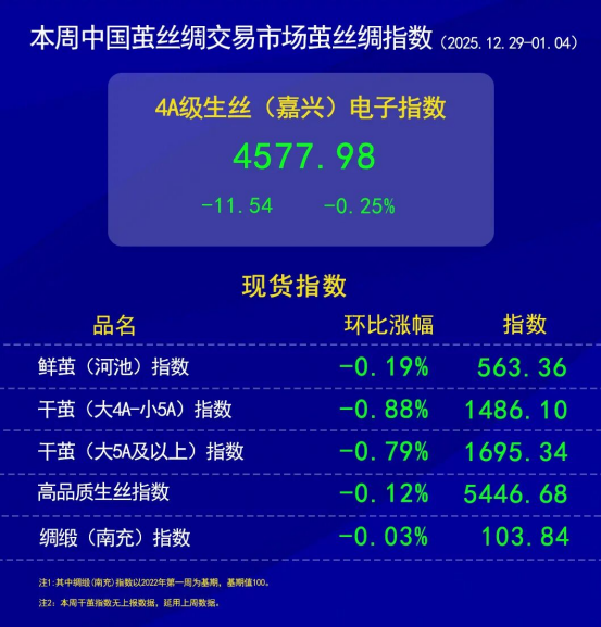跨年首周,繭絲綢各指數(shù)呈現(xiàn)不同程度收跌態(tài)勢(shì)。