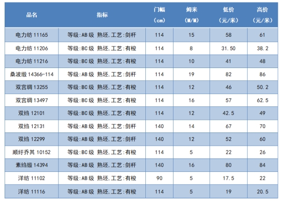 本周綢緞指數(shù)協(xié)作單位成交價(jià)格區(qū)間