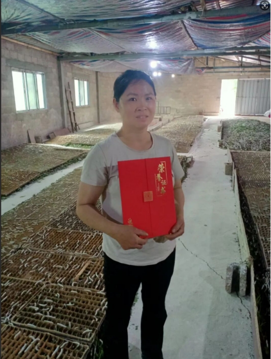 創(chuàng)業(yè)初期并非一帆風順,資金短缺曾讓她犯難。鎮(zhèn)村婦聯(lián)及時對接政策,2021年幫助其申請到15萬元農(nóng)村婦女創(chuàng)業(yè)貸款。這筆“及時雨”讓她建成600平方米標準化廠房,實現(xiàn)了“桑葉種植—蠶繭養(yǎng)殖—統(tǒng)一銷售”的全流程管理。2023年養(yǎng)殖年收入達15萬元,一舉成為田蓬鎮(zhèn)規(guī)模化種桑養(yǎng)蠶的“標桿”,“蠶娘”的名號也隨之在十里八鄉(xiāng)傳開,2023年12月蔡梅被富寧縣婦聯(lián)評為富寧縣農(nóng)村致富帶頭人。