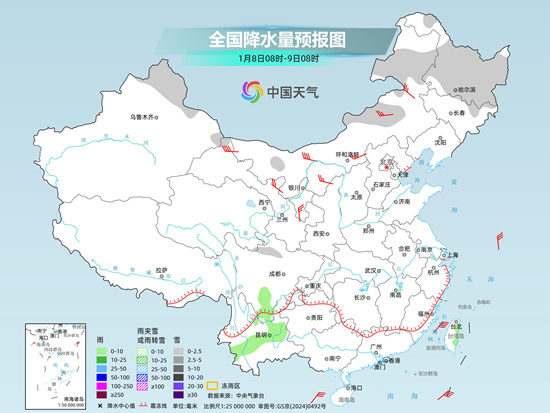 昨天,我國大部雨雪稀少,東北地區(qū)出現(xiàn)分散性弱降水。監(jiān)測顯示,7日8時(shí)至8日6時(shí),黑龍江中東部、吉林中東部等地出現(xiàn)小到中雪或雨夾雪。