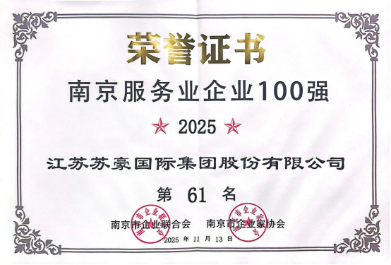 近日,南京市企業(yè)聯(lián)合會、南京市企業(yè)家協(xié)會正式發(fā)布2025年南京市綜合百強(qiáng)企業(yè)及相關(guān)榜單。蘇豪股份入選“2025年南京市服務(wù)業(yè)百強(qiáng)企業(yè)榜單”!