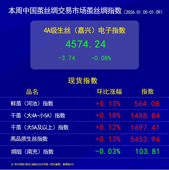 今日(2026年1月9日,周五)中國繭絲綢交易市場生絲電子指數(shù)微跌0.06%報收于4574.24點,本周生絲指數(shù)累計下跌0.08%。B絲2022D(商檢4A級生絲):260125合約報平,收于45.72萬元;260325合約下跌0.03萬元報收于46.08萬元;260925合約報平,收于45.72萬元。