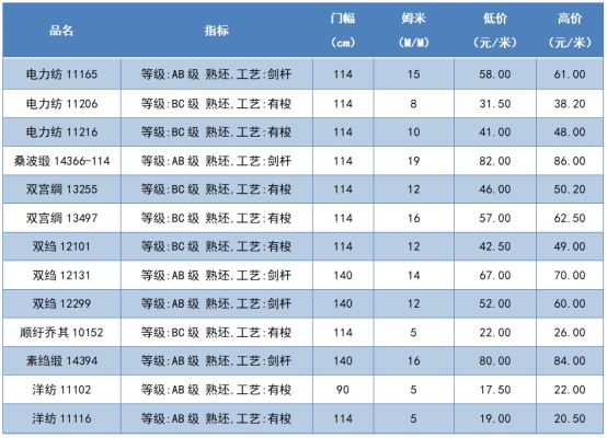 本周綢緞指數(shù)協(xié)作單位成交價格區(qū)間