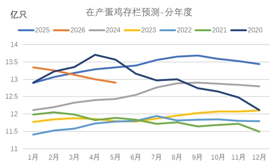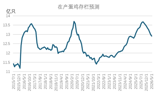 從雞苗補欄情況來看,2025年7月開始,樣本雞苗補欄量(占實際補欄占比50%)開始同比下滑,且下半年雞苗補欄同比下滑幅度逐月擴大。數(shù)據(jù)顯示,8-12月雞苗單月銷量同比降幅分別為9.4%、14.1%、12.7%、13.4%及13.9%,基本每個月的同比降幅都在10%左右。我們用雞苗補欄后5個月開產(chǎn)進行測算,預(yù)計2026年1月至2026年5月期間,新開產(chǎn)蛋雞數(shù)量將持續(xù)處于低位。2025年下半年行業(yè)低迷的補欄將使得2026年上半年蛋雞新開產(chǎn)壓力顯著降低。