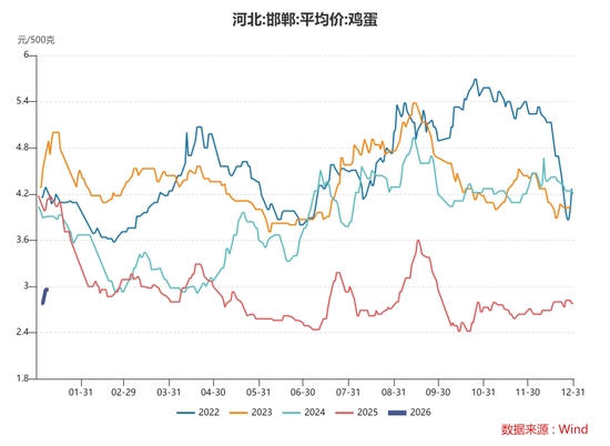 2025年四季度,雞蛋(3976, -26.00, -0.65%)現(xiàn)貨價格持續(xù)低位震蕩。不過自元旦開始,雞蛋現(xiàn)貨價格出現(xiàn)小幅走強跡象。以河北敦樸貿(mào)易為例,45斤雞蛋報價從1月1日的121元上漲至1月8日131元。我們分析認(rèn)為,1月份開始雞蛋現(xiàn)貨價格將逐步具備走強動能。