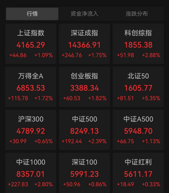 截至收盤,滬指漲1.09%,深成指漲1.75%,創(chuàng)業(yè)板指漲1.82%,北證50漲5.35%。