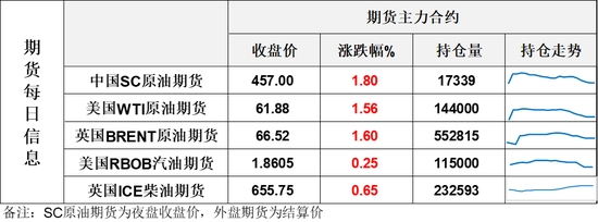【1】WTI主力原油期貨收漲0.95美元,漲幅1.56%,報(bào)61.88美元/桶;布倫特主力原油期貨收漲1.05美元,漲幅1.6%,報(bào)66.52美元/桶;INE原油期貨收漲1.8%,報(bào)457元。