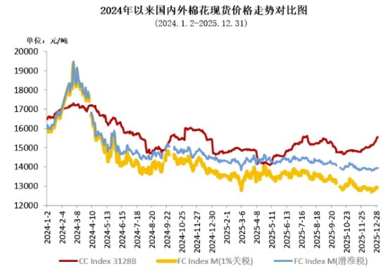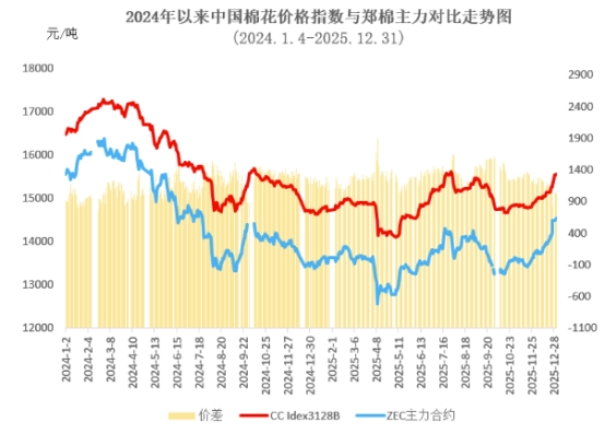 12月市場關(guān)注2026年棉花目標(biāo)價(jià)格政策調(diào)整,鄭棉期貨看漲預(yù)期較強(qiáng),資金參與度顯著提升,主力合約CF2605震蕩上行,月初結(jié)算價(jià)在13760元/噸,月中突破14000元/噸關(guān)鍵阻力位后加速拉漲至月末14550元/噸高位。相比于現(xiàn)貨價(jià)格,期貨市場對(duì)基本面和消息面反應(yīng)更為強(qiáng)烈,期現(xiàn)價(jià)差有所縮小,月末鄭棉主力結(jié)算價(jià)14550元/噸,低于同期價(jià)格指數(shù)1006元/噸,兩者價(jià)差環(huán)比收窄185元/噸。鄭棉主力合約月均結(jié)算價(jià)14009元/噸,環(huán)比上漲467元,同比上漲504元。