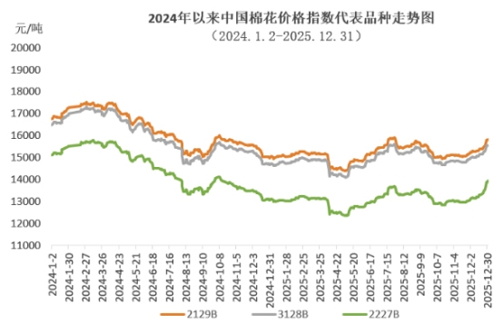 2025年國內(nèi)棉價(jià)震蕩運(yùn)行,總體呈現(xiàn)“先穩(wěn)后跌、再漲回升”的波動(dòng)走勢。受美國加征關(guān)稅政策沖擊,中國棉花價(jià)格指數(shù)年內(nèi)最低跌至14100元/噸,但在國內(nèi)促消費(fèi)政策、中美經(jīng)貿(mào)磋商進(jìn)展等因素影響下年中最高漲至15609元/噸,下半年新疆棉花產(chǎn)量再創(chuàng)新高,對(duì)棉價(jià)上漲有所抑制,但在宏觀環(huán)境改善的推動(dòng)下年底仍回升至15500元/噸以上的年度相對(duì)高位。中國棉花價(jià)格指數(shù)全年均價(jià)14903元/噸,同比下跌6.7%。
