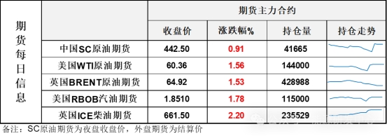 【1】WTI主力原油期貨收漲0.93美元,漲幅1.56%,報60.36美元/桶;布倫特主力原油期貨收漲0.98美元,漲幅1.53%,報64.92美元/桶;INE原油期貨收漲0.91%,報442.5元。