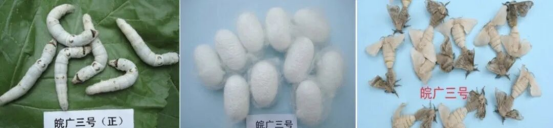 皖蠶6號(hào),蟲蛹率98.44%,繭層率21.02%;盒種平均產(chǎn)量48.0公斤,比對(duì)照品種秋豐×白玉提高約7.07%。皖豐×潤康,蟲蛹率98.47%、繭層率20.86%,繭絲長1045.79米;該品種為血液型膿病“超強(qiáng)”抗性蠶品種。皖廣3號(hào),蟲蛹率99.01%,萬蠶收繭量和萬蠶繭層量分別高于對(duì)照組合薪杭×白云5.18%和5.38%。皖蠶8號(hào),蟲蛹率99.32%,萬蠶收繭量、萬蠶繭層量分別高于對(duì)照菁松×皓月4.43%、5.96%。