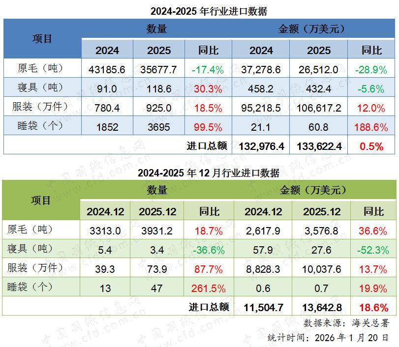 進(jìn)口方面,2025年,我國(guó)羽絨行業(yè)進(jìn)口總額約13.4億美元,同比上漲0.5%。其中,原毛進(jìn)口量值齊跌,同比分別下降17.4%、28.9%;服裝進(jìn)口量值同比均明顯上漲,漲幅分別為18.5%、12.0%。寢具進(jìn)口量值依然較低,在進(jìn)口占比中較小。