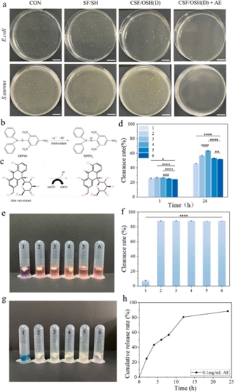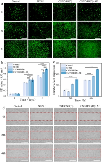抗菌實驗結果表明,CSF/OSH (D) +AE(蘆薈提取物)組中的水凝膠對大腸桿菌和金黃色葡萄球菌具有優(yōu)異的抗菌性能。CSF/OSH (D)水凝膠中的AE通過凝膠的孔隙結構釋放到DPPH測試溶液中,并在其中發(fā)揮抗氧化活性。體外細胞實驗結果顯示,水凝膠均表現(xiàn)出具有良好的細胞相容性,CSF/OSH (D) +AE 水凝膠在促進細胞增殖和遷移方面也表現(xiàn)出良好的性能。